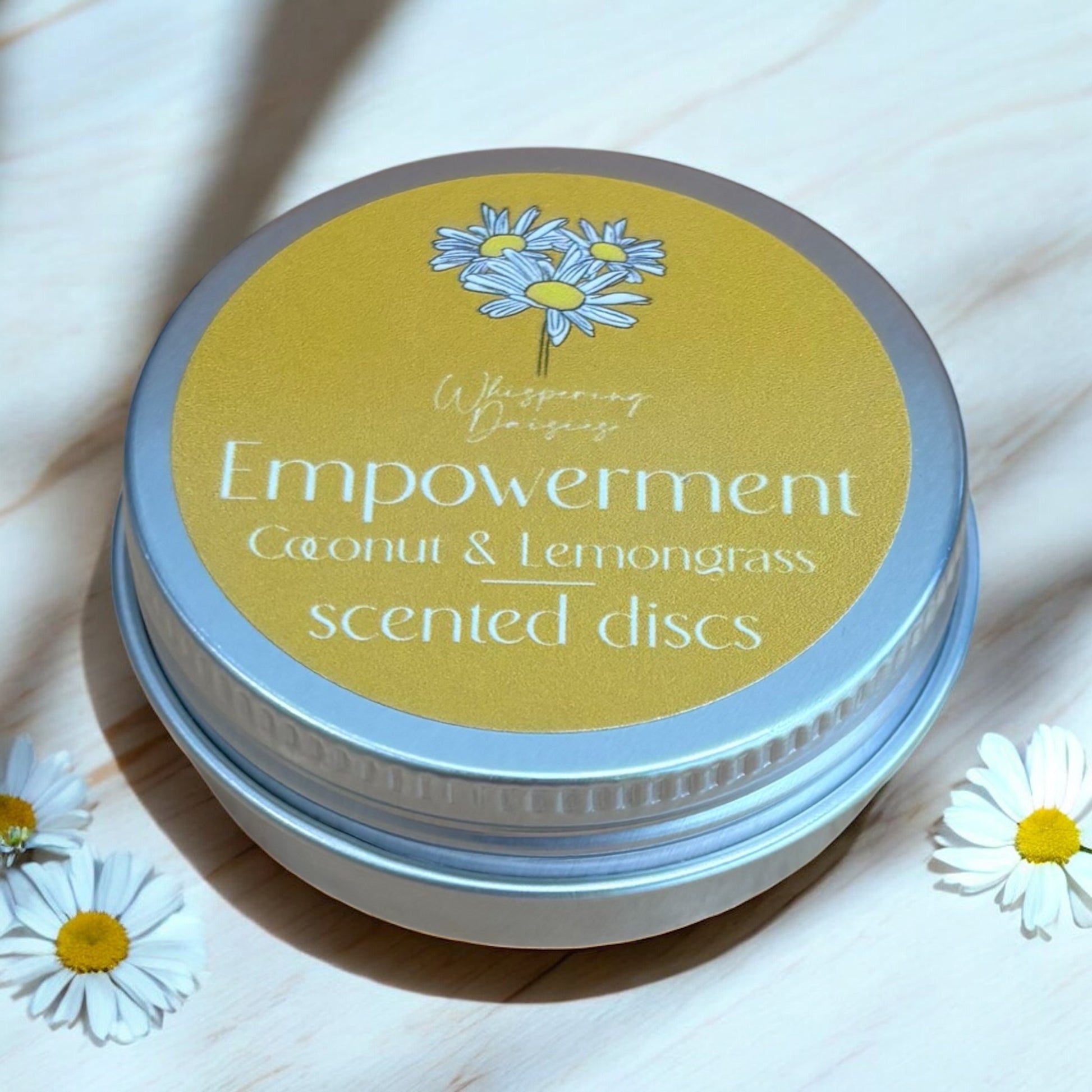 Empowerment Scented Discs from Whispering Daisies. These versatile fragrance discs are perfect for your car diffuser or hoover filter, filling your space with a vibrant, uplifting aroma every time you drive or clean. Each tin contains 10 beautifully crafted, coloured felt discs, sealed to lock in freshness until you’re ready to enjoy them.