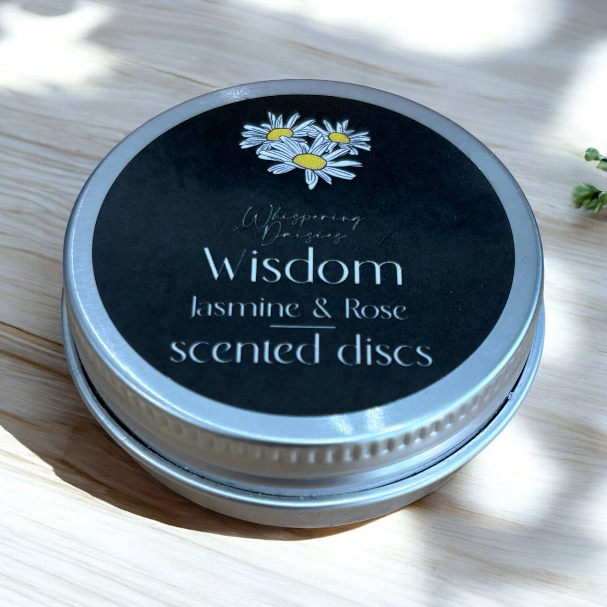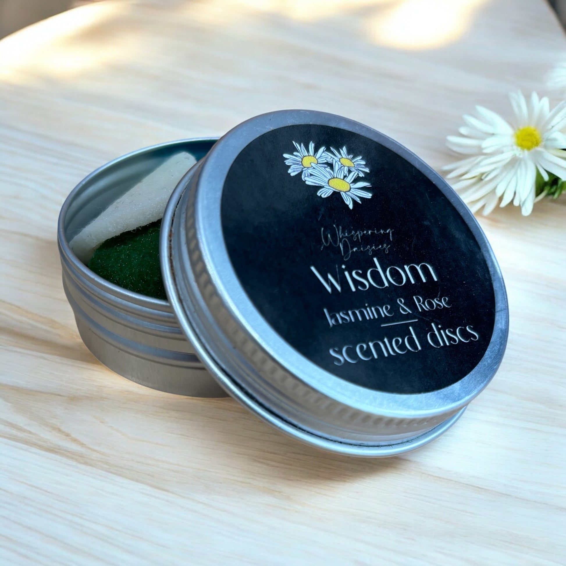 Wisdom Scented Discs from Whispering Daisies. These versatile fragrance discs are perfect for your car diffuser or hoover filter, filling your space with a vibrant, uplifting aroma every time you drive or clean. Each tin contains 10 beautifully crafted, coloured felt discs, sealed to lock in freshness until you’re ready to enjoy them.